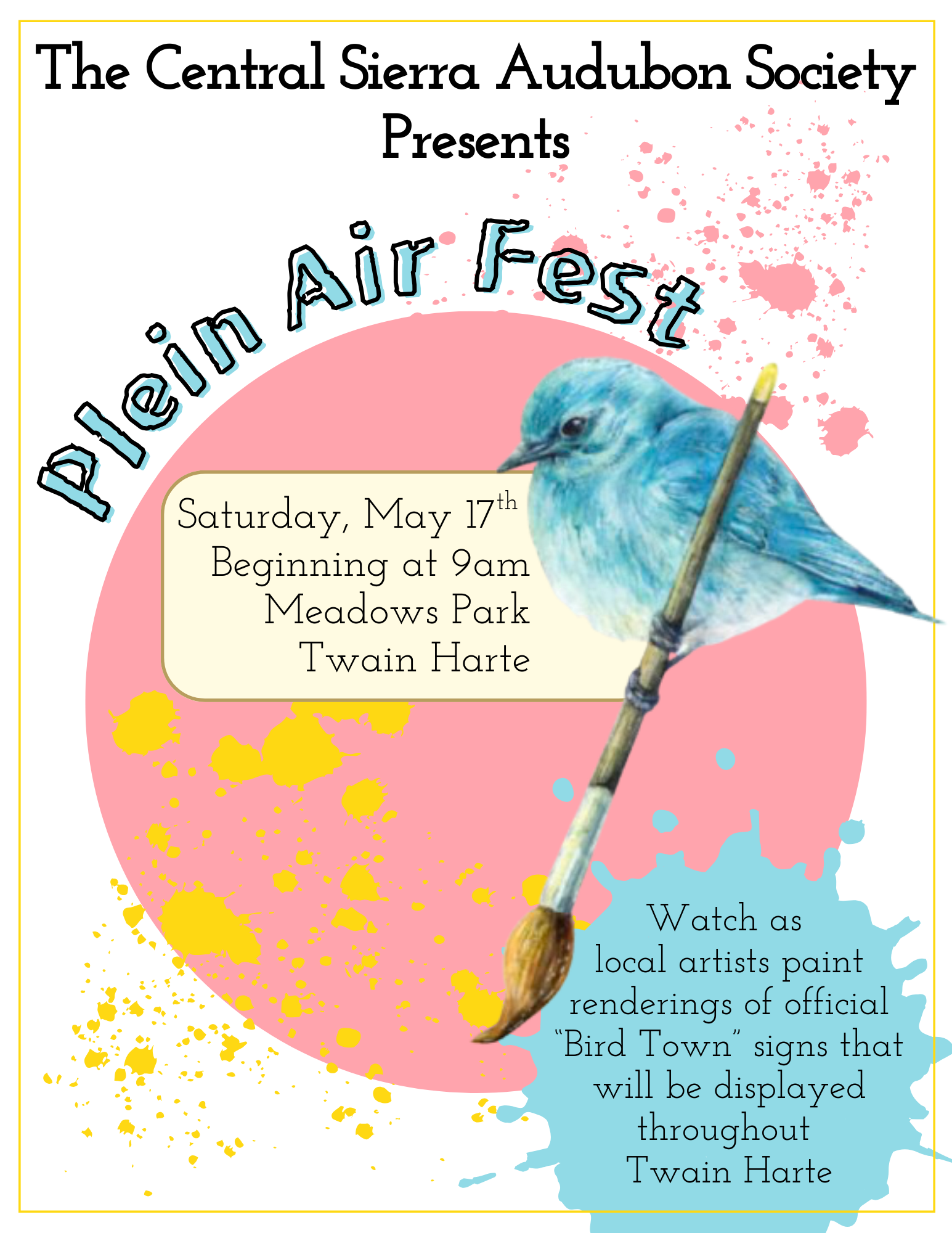 Twain Harte has been declared an official bird town by the Central Sierra Audubon Society! In celebration of this honor, they are holding a Plein Air event on May 17th at Meadows Park in Twain Harte. The event will feature local artists painting renderings of official "bird town" signs. The event is free and we encourage spectators to enjoy brunch afterward at our local restaurants.